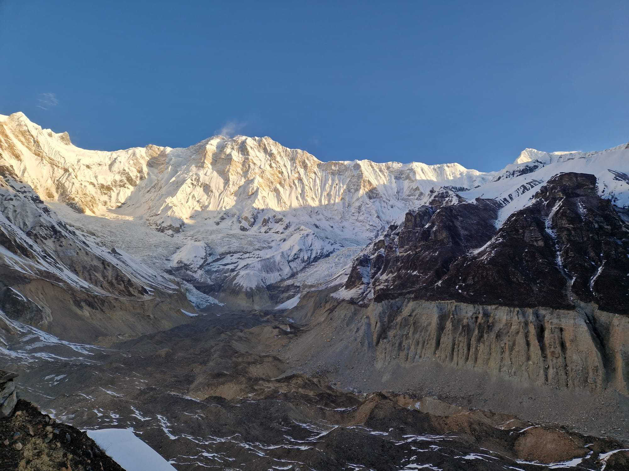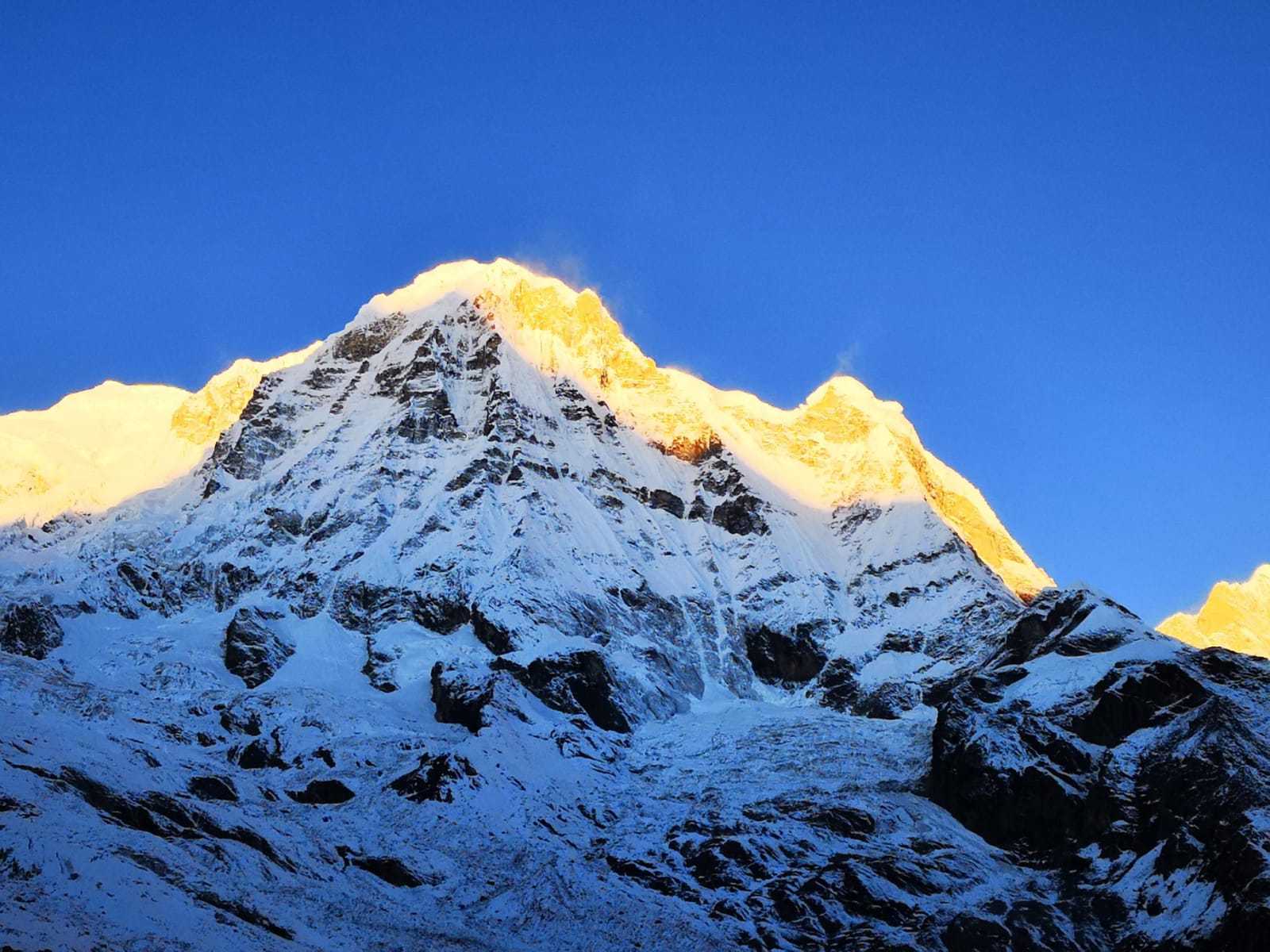 Estaremos cerca de los impresionantes picos del Machapuchare, que observaremos a través del valle. A nuestro paso encontraremos la cascada de Modi Khola y seguiremos subiendo cerca del río, oyendo el fuerte sonido de sus aguas. Los árboles se tornarán más pequeños y el valle se hará más ancho mientras alcanzamos la cueva Hinko, el refugio original de los pastores en esta ruta. Almorzaremos en Deorali (3.230 m), el último lodge antes de entrar al santuario. El hermoso pico Gangapurna estará en frente nuestro, mostrándonos un adelanto de lo que encontraremos luego. Avanzaremos y casi sin darnos cuenta, estaremos dentro del santuario rodeados por montañas que nos dejarán sin aliento. En frente tenemos el campo base del Machapuchare (3.703 m) hasta donde llegamos y tras descansar un rato, continuamos ascendiendo solo un par de horas por pendientes moderadas hasta alcanzar el Campo Base del Annapurna (4.130m.). Probablemente notemos la falta de oxígeno, pero nos lo tomaremos con calma porque dispondremos de suficiente tiempo. El paisaje que podremos contemplas es indescriptible, una verdadera línea ininterrumpida de picos imponentes: Hinchuli, Annapurna Sur, el mismo Annapurna (cara sur o “Fang”), Fluted, Tent, Annapurna III, Gandharba Chuli y la maravillosa pirámide de la cara norte del Machapuchare. Alojamiento en Lodge.